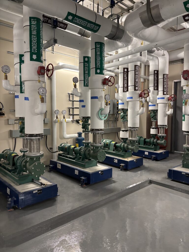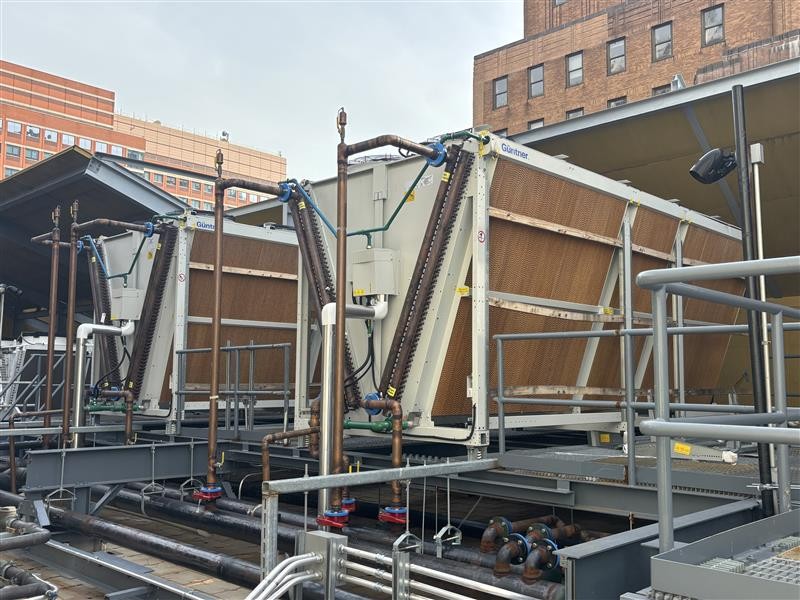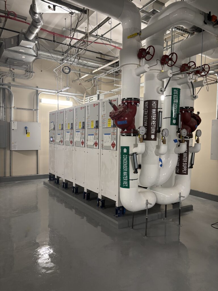 - Adiabatic Fluid Coolers: To maintain balance when the building generates more heat than it can consume, three 2,000 MBH adiabatic coolers provide supplemental rejection, using significantly less water and energy than traditional cooling towers.